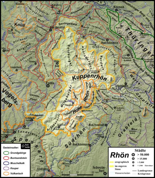 Die Rhön ist ein gut 1500 km² großes Mittelgebirge im Grenzgebiet der deutschen Länder Bayern, Hessen und Thüringen und in seinem Kernbereich ein Biosphärenreservat. Das Gebirge im äußersten Südosten des (hier länderübergreifenden) Osthessischen Berglandes ist teilweise vulkanischen Ursprungs. Der höchste Berg der Rhön ist die im hessischen Bereich liegende Wasserkuppe (950,2 m). In der Rhön befinden sich mehrere Skigebiete. Der Name Rhön wird oft vom keltischen raino (= hügelig) abgeleitet, jedoch sind auch zahlreiche weitere Interpretationen möglich. Mittelalterliche Aufzeichnungen Fuldaer Mönche bezeichnen die Umgebung von Fulda und somite auch weite Teile der Rhön als Buchonia, Land der Buchenwälder. Im Mittelalter war die Buche ein wichtiger Rohstofflieferant. Duch großflächige Rodungen entstand das Land der offenen Fernen mit heute etwa 30 % Waldbestand.